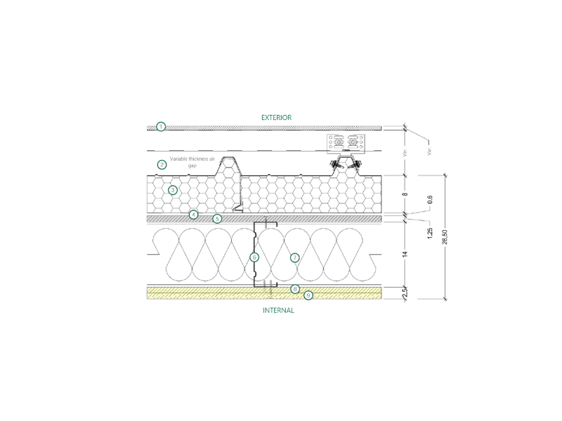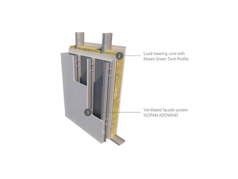 Envolupant exterior portant de marc metàl·lic estructural d’acer lleuger Manni Green Tech® [LSF], revestiment interior de guix laminat i sistema de façana ventilada mod. ISOPAN ADDWIND.